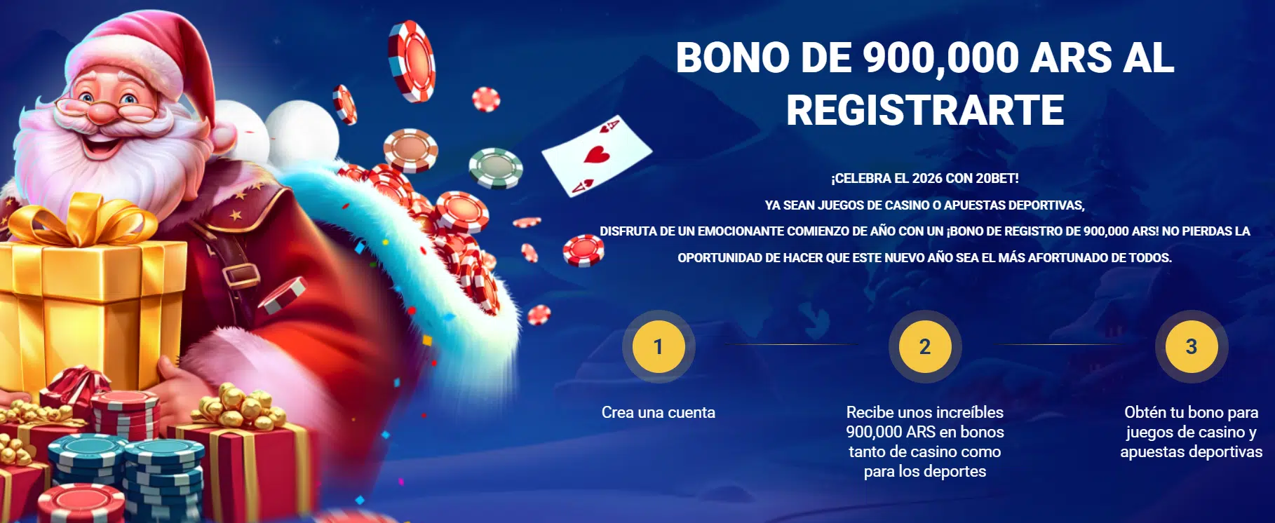 El nuevo bono sin depósito de 20Bet asciende a una cantidad de $900.000 ARS solo por el hecho de registrarse en la plataforma. Puedes hacerlo hasta el 9 de enero de 2026, ya que la marca ha decidido dejar esta promoción activa durante un mes entero. Los que ya se hayan beneficiado de ella habrán tenido regalo navideño anticipado, mientras que el resto pueden hacerse con este como felicitación por la entrada en el nuevo año.